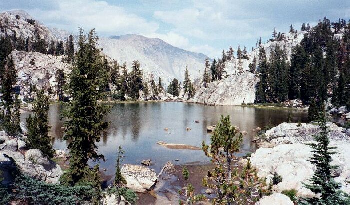Hunewell Peak looms in the distance over Robinson Lake near where the trail leaves the lakes.
