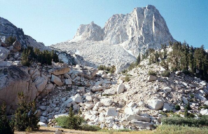 The pure white granite of The Juggernaut flanks the Mule Pass trail. To the right you can see the trail switchbacking below the trees.