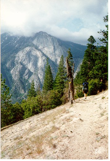 We dropped our loads once the trail stopped switchbacking and began the traverse up the Copper Creek Canyon, and took a short break to eat our belated lunch. We started off again, welcoming the more shaded climbing. For once it was Dave sucking wind on the slow grind upward, and I was thankful for the Sphinx Lakes trip I did two weekends prior that gave me a jump-start on conditioning. The heat was encouraging foot blisters however, which was to plague us both over the next few hot days. Eventually the last steep section of trail was crested and I was at Lower Tent Meadow, the lowest and most dirty, overused and boring camp of the trip. I dropped my load and scouted out the remaining camp-sites (others were there), then waited for Dave. After Dave showed up, we scouted the area, and I discovered two people I had met two weeks before on the Sphinx Lakes trip! Small world.