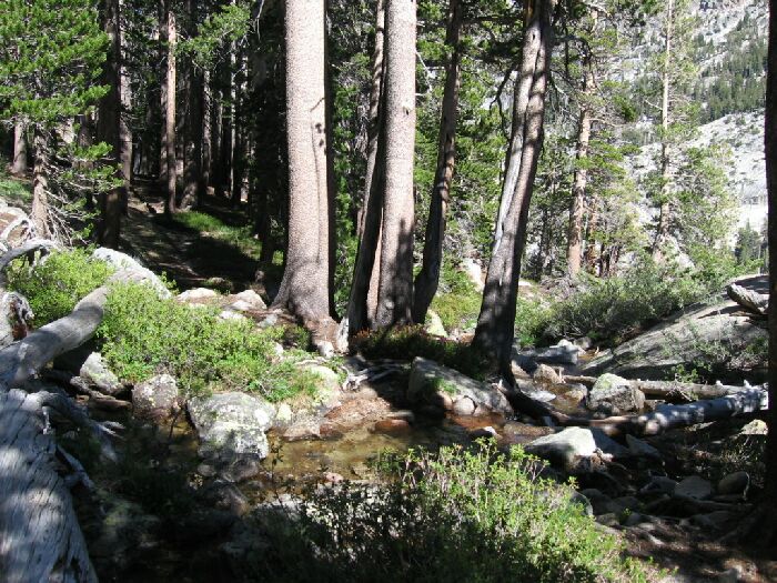 This is one of the classic camps in the Sierra, all the better because about 20 yards down trail is another camp area only slightly the lesser of the two camps. That means there is plenty of room in the area, a good thing in case one of the camps are occupied. We had the prime camp, which means we had ready access to water, flat spots, no useless fire-pit, shade and the lullaby of the falls nearby.