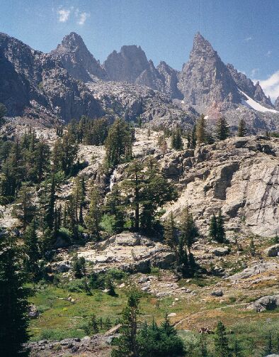 A Cross-Country Traverse of the Minarets, August/September 2006The maps do not show it very well, but after passing through the level park with the stream, the trail takes a wide loop and begins series of switchbacks that end way to the right looking up, then does a long level traverse north, still gaining altitude slightly.