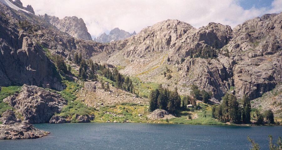 Eventually I made my way back to the main trail where we pick up on the progress of the main trip.Here I am on the south shore of Minaret Lake, looking north-west. In the trees on the right far shore is an extensive camp site (and more in the other clump of trees). The yellow line shows the general path of the crude use trail to Cecile Lake.