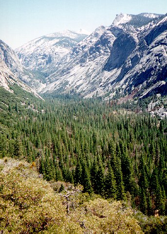 From the Copper Creek Trail you can see the broad flat "yosemite" valley of Kings Canyon, and up canyon the hanging valley of Bubbs Creek canyon. Further up the canyon on the right is the cut of Sphinx Creek that holds the Sphinx Creek Trail