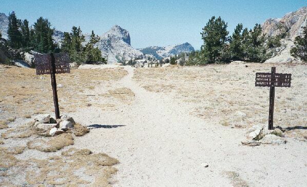 Finally the trail gradually leveled out in a most annoying way and reached the broad flat pass area (~10,121 feet) between sandy hills and cliffs. I dropped my pack like a sack of bricks and grabbed my camera.Looking to the east I could look up the Wilson Creek drainage to Doghead and Quarry Peaks, and beyond to the Sawtooth peaks on the Sierra Crest. It all looked like inviting country to explore. Benson Pass was no Burro or Mule Pass, but it was still nice to be there with the pleasant views and knowing it was mostly downhill all the way to Benson Lake.