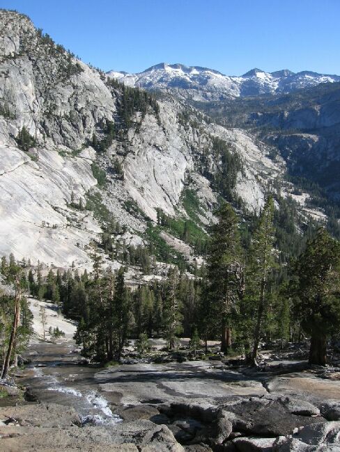 But other features recommend the camp. First there is the waterfall, which launches itself over the lip of a rock above the trail in roughly three equal parts about 30 feet from the trail and the ford, where it cascades down a slope to the ford. From there it takes a left into an "S" turn and then launches itself in a cascade down a pure unjointed steep slope of granite, part of the canyon walls of the Lyell Fork. It drops about 800 feet into the depth of the canyon below to meet the Lyell Fork, but you lose sight of the waters long before it reaches the river.