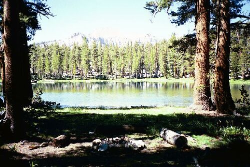The trail finally reached the top and reached a very level area that may at one time been part of the Chagoopa Plateau. It certainly looked flat enough. Hiking was now a breeze, and I fairly sailed along. The forest was now fairly thick; the only feature of note was the granite ridge rising West of where the trail topped out. However, at about the halfway point of the crossing of the flat area and at exactly 10,000 feet and to the right side of the trail, there is a small charming lake with an ideal camp among the trees. I took advantage of this picturesque spot to drop my pack for my first real rest of the day. I snapped a few pictures then sat in my chair for a while munching on my mid-morning snacks and enjoying the ideal conditions and temperatures. It was too bad I had to move on, for I would have loved to have spent the night at such a chimerical spot in the grand Sierra. The view featured the white granite crags to the west reflected in the waters of the small intimate unnamed lake. I have always loved these small tarns and lakes much more than their larger cousins. Usually they are much warmer than large lakes and make for great swimming. This lake looked a little shallow for that kind of activity.