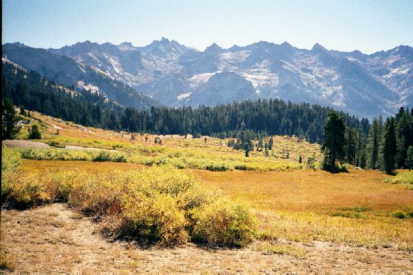 Alta Meadow in its Fall colors. Black Kaweah is the highest peak seen here. Below that peak you can make out Kaweah Gap where the High Sierra Trail crosses.
