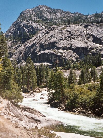 The trail fairly leisurely lost the altitude so recently gained with sweat, and right off the bat left the hot open for the cool shade of a small forest. Eventually the trail met the river near where the river bent upstream to the east, granting the hiker a long level section of walking. At one point the trail edged the river where the trail was blasted out of solid rock, similar to sections along the Merced River.